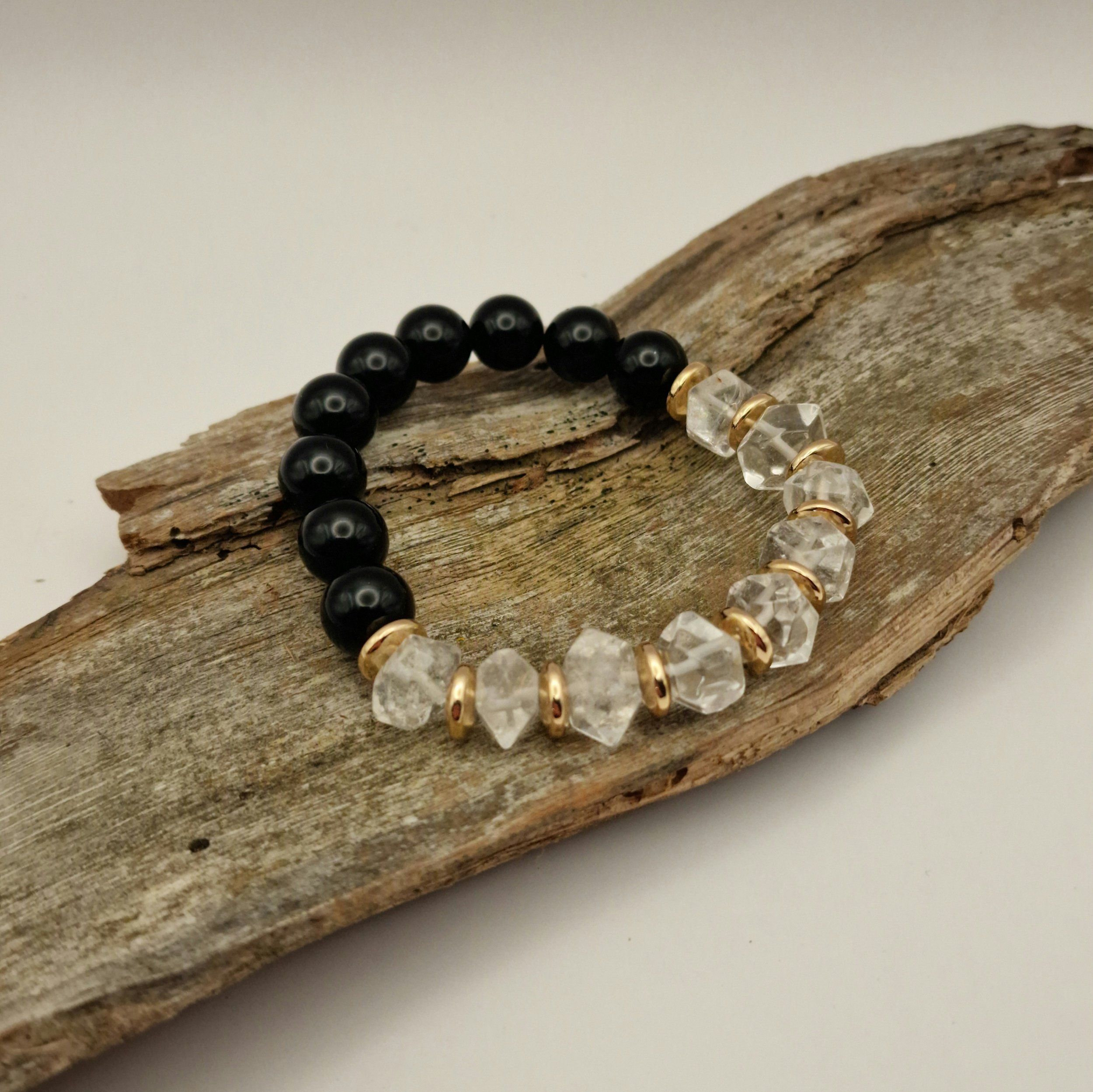 Schwarzer Obsidian und rohe Bergkristall-Chunks — zwei Pole die sich gegenüberstehen, ohne sich aufzulösen. Gold-Hämatit als Scharnier zwischen den Welten. Dunkelheit und Klarheit, unvereinbar und doch untrennbar.